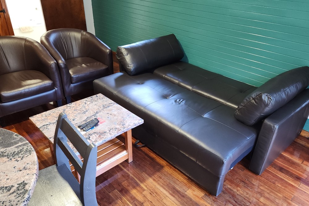 One Bedroom Chalet. Main Bedroom with double bed. One pull-out Sleeper Couch in the Livingroom. Open plan living room and Kitchen: stove, fridge and microwave. DSTV (selection of channels). Bathroom with bath or shower and toilet. Open braai area. Open parking. Maximum 4 Persons.